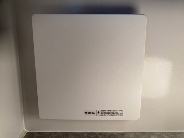 新しい浴室換気扇は、DVF-T10CB、東芝、ワンタッチルーバー、フラットパネル、24時間換気対応、天井埋込、浴室換気扇です。