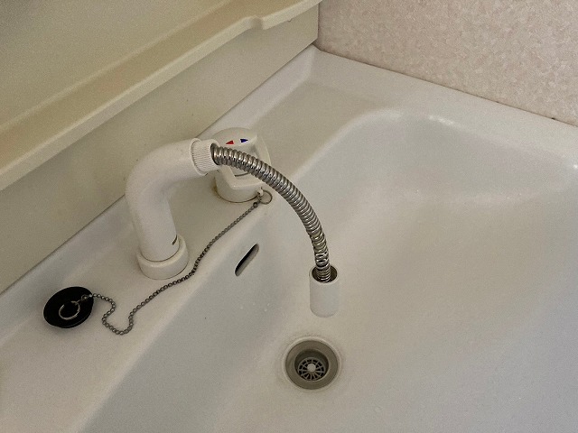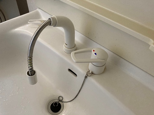 既存の洗面台水栓は、FA244-021、MYM、ホース収納式シングルレバー洗髪シャワー混合水栓、洗面台水栓です。